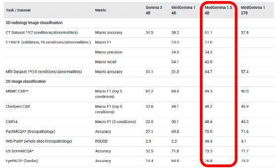 MedGemma 1.5 4B 在继承前代模型对文本与二维医学影像(如 X 光片、病理切片)分析能力的基础上,首次实现对 CT 与 MRI 三维医学影像的兼容与解析,可进行病灶检测、结构分割与辅助报告生成等任务。基准测试数据显示,该模型在综合性能上超越前代 4B 版本,并在部分专项任务中的表现优于参数规模更大的 27B 版本,且在运算效率方面更具优势,因而更适用于本地部署与边缘计算场景,能够在保障数据隐私的前提下完成高质量推理。