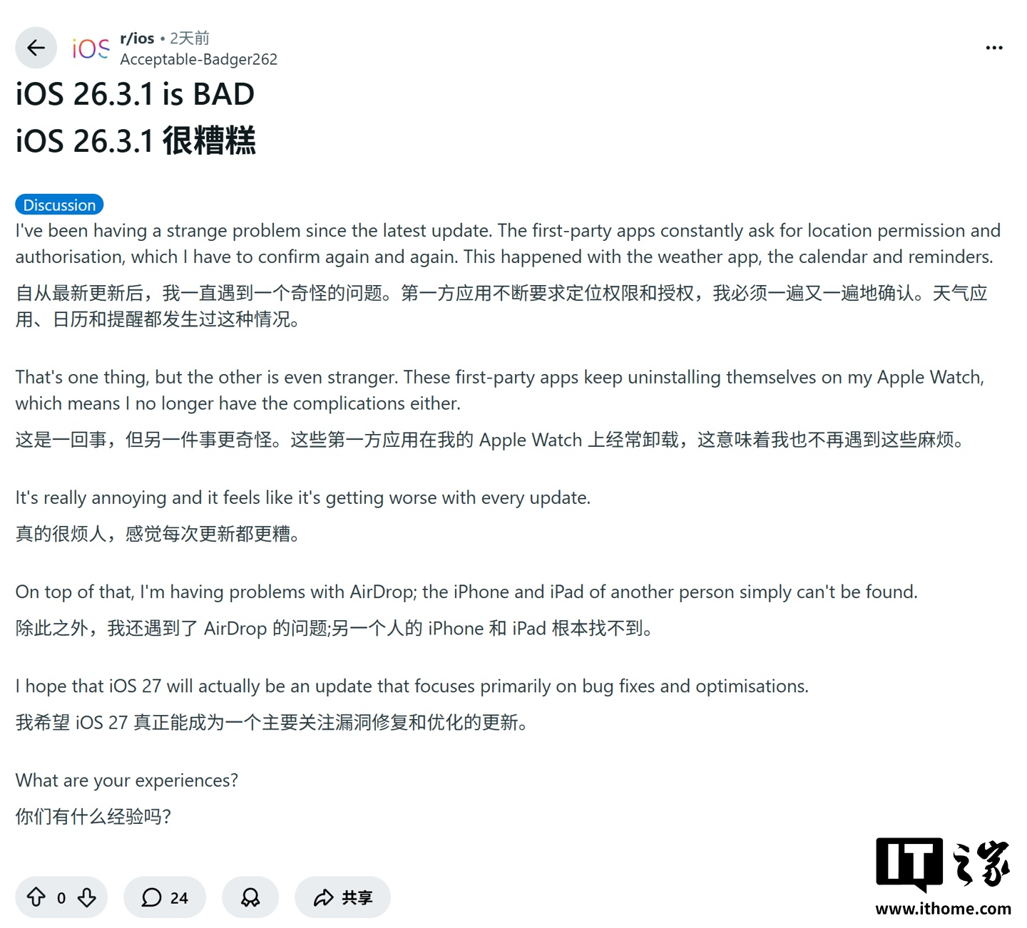部分 iPhone 17 等机型用户在安装 iOS 26.3.1 更新后反馈出现断网 系统响应变慢等 BUG,引发对新版本稳定性与回归测试覆盖度的讨论,回应公众对系统更新可靠性的持续关注,在移动操作系统迭代中被视为质量保障环节的警示案例。据消息称问题集中在特定基带固件与后台进程调度逻辑,现场测试显示在部分网络环境下重连耗时延长。此举在版本发布与用户反馈闭环中引起讨论,为观察快速迭代下的回归测试策略提供实例,促使团队重新审视新功能与旧硬件兼容性的验证深度,后续可留意修复补丁推送节奏与受影响机型范围。