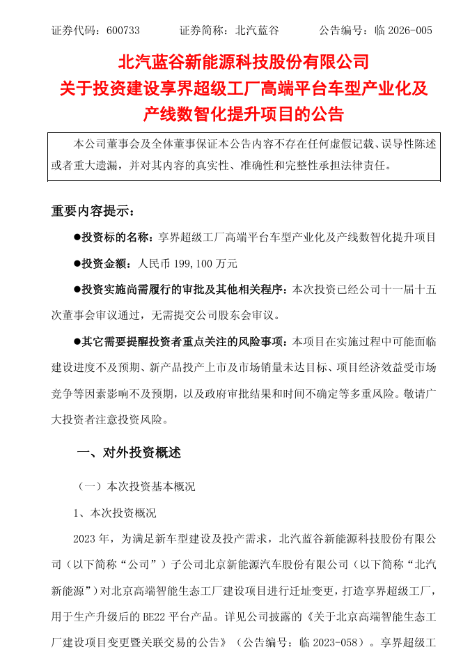 北汽蓝谷近日披露,拟投资19.91亿元对享界超级工厂进行升级,以提升产能与制造能力适配新产品需求。据官方消息,该项目计划在生产工艺、自动化设备及质量检测体系等方面进行优化,已在公司内部战略规划与供应链协作环节中引起较多讨论,被视为北汽蓝谷强化高端智造布局的参考样本。