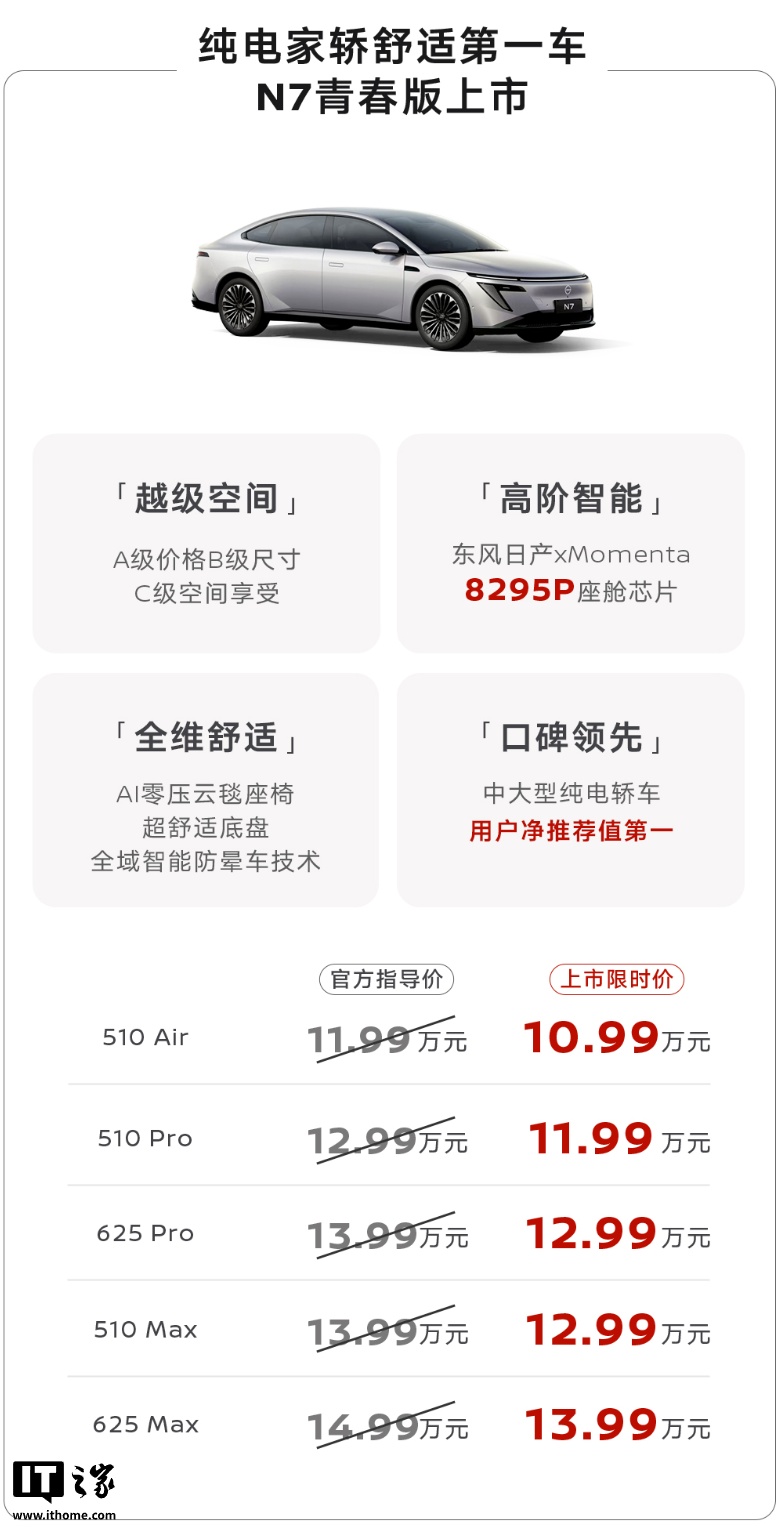 东风日产 N7青春版纯电轿车上市,限时价10.99万元起,为品牌在主流纯电轿车细分市场增添新选项。作为东风日产面向年轻家庭与首购用户推出的车型,N7青春版延续品牌在电动化领域的布局,以相对亲民的定价与纯电驱动形式切入10至12万元价格带,在近期新能源轿车市场中引起讨论,被视为东风日产扩大电动产品覆盖面的实际举措。据官方消息,新车上市基于现有生产线调整与渠道准备完成,限时价策略意在提升新车初期关注度与订单转化。