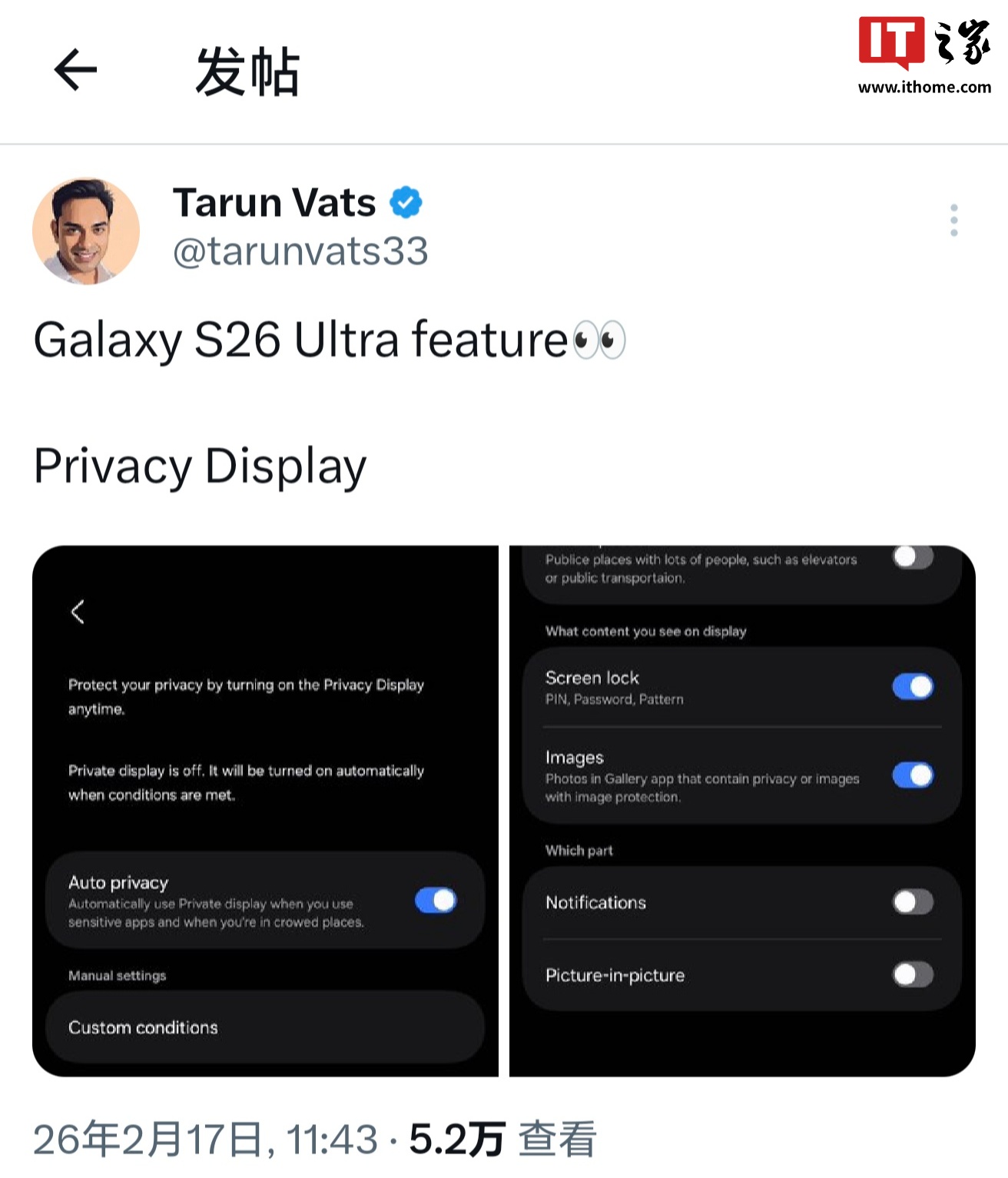 消息称,界面中“自动切换”可依据环境光线与观看角度动态调整防窥强度,“按内容触发”则能识别当前显示内容类型,例如金融类页面或私密信息界面自动启用高防窥级别,普通浏览状态下保持常规可视范围。现场观察显示,设置菜单还允许自定义防窥角度范围与时长,便于平衡隐私保护与多人共享观看的需求。三星尚未对该界面真实性作出回应,但业内分析认为,此项功能直击用户在公共场合使用手机时的隐私痛点,若正式落地,将提升Galaxy S26 Ultra在商务与安全敏感用户中的吸引力。在智能手机隐私防护领域,该曝光内容在数码社区与安全应用圈引起较多讨论,被视为厂商细化场景化隐私控制的参考样本。
