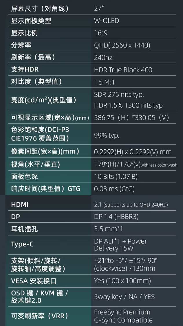 消息称,GO27Q24G在色彩表现上延续OLED广色域优势,覆盖99% DCI-P3与100% sRGB色域,峰值亮度达1000尼特(局部峰值),支持HDR10与杜比视界,能在高刷场景下呈现鲜活色彩与明暗层次。现场观察显示,其搭载技嘉独有的“OLED CARe”防护技术,通过像素位移、自动亮度限制与散热优化,降低烧屏风险并延长面板寿命;支架支持升降、倾斜、旋转及竖屏调节,适配不同坐姿与游戏环境;接口配置包含HDMI 2.1、DisplayPort 1.4与USB Hub,满足PC、次世代主机等多平台直连需求。技嘉表示,该显示器针对高速运动画面进行算法补偿,减少拖影与撕裂,配合Adaptive-Sync可变刷新率技术,可在高帧率游戏中保持画面稳定流畅。在电竞显示与OLED技术普及领域,该新品在硬件社区、装机圈与游戏玩家群体中引发较多关注,被视为观察W-OLED从高阶专业领域下沉至主流电竞市场的参考样本。